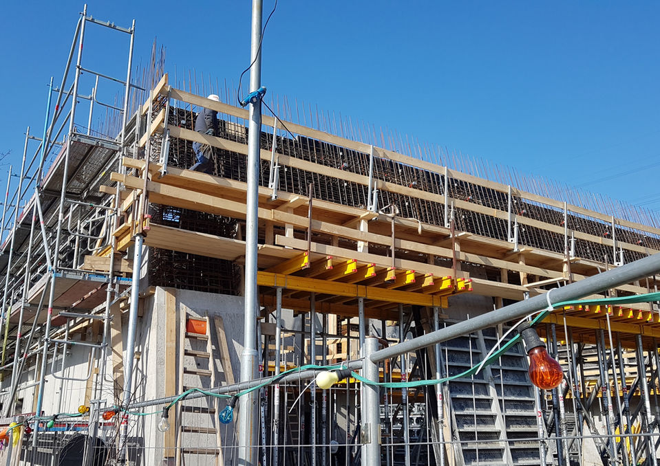 Der horizontale Lastabtrag erfolgt über Stahlbetonflachdecken, welche auf den Wänden auflagern. Die Aussteifung erfolgt über Kern- und Giebelwände.